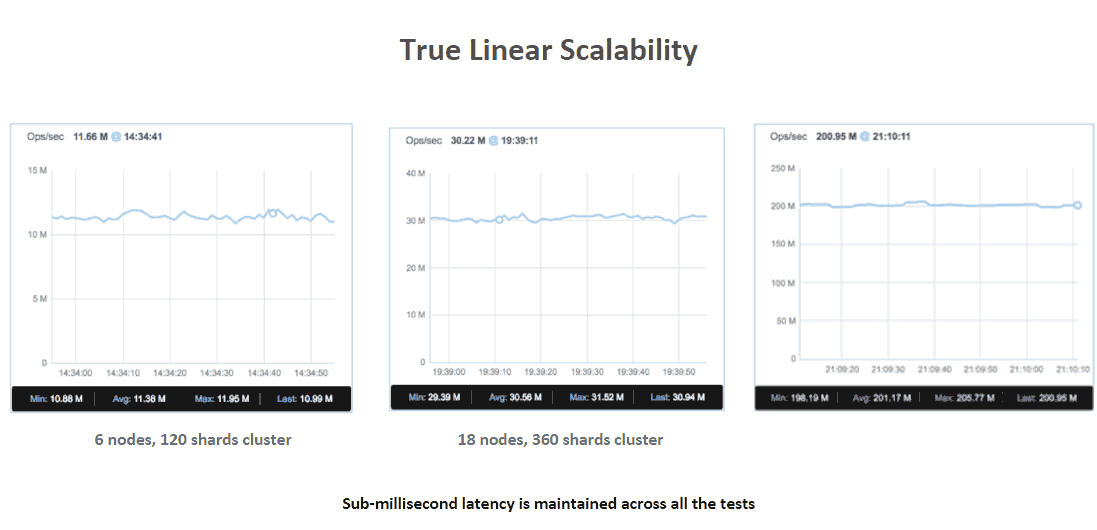 When working with the OSS cluster API, Redis Enterprise is scaled in a true linear manner. The figure below summarizes the results of a series of benchmarks: